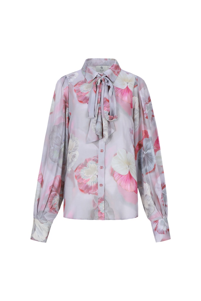 Blouse van C&S the Label in een bloemendessin met lange pofmouwen, strikkraag en knoopsluiting. Materiaal: Viscose 100%