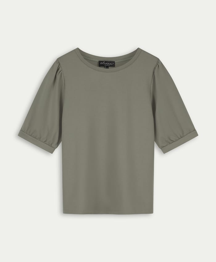 Trui van Elvira met korte mouwen, subtiele plooien op de schouders en ronde hals. Materiaal: Viscose 61%| polyester 36%| elastan 3%