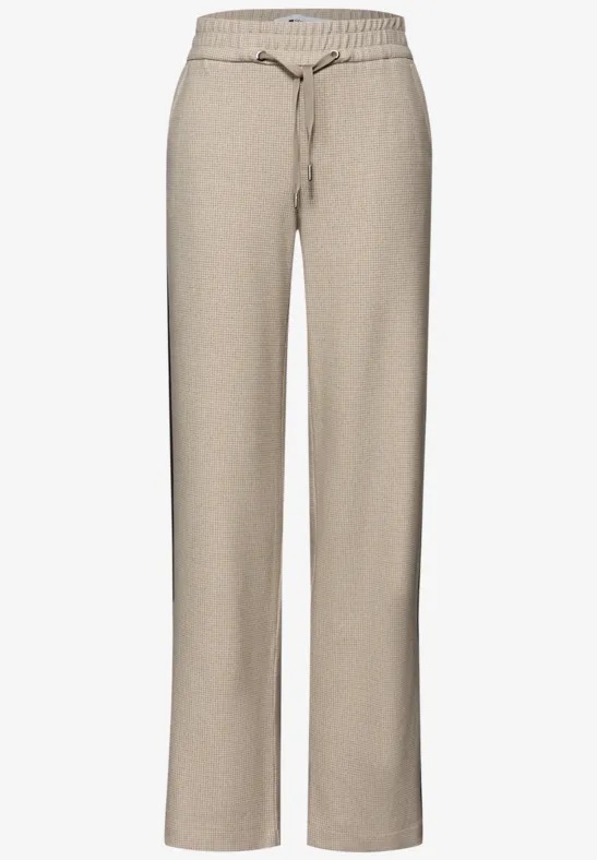 Broek van Street One in een subtiel pepita dessin met rechte pijpen voorzien van contrasterende bies aan de zijnaden, steekzakken, twee paspelzakken en een elastische tailleband voorzien van trekkoord. Materiaal: Polyester 62%| viscose 33%| elastan 5%