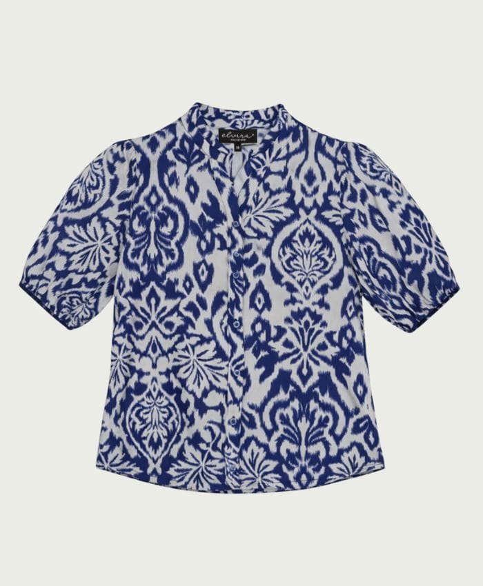 Blouse van Elvira in een all-over dessin met korte pofmouwen, opstaande kraag, V-hals en een knoopsluiting.
