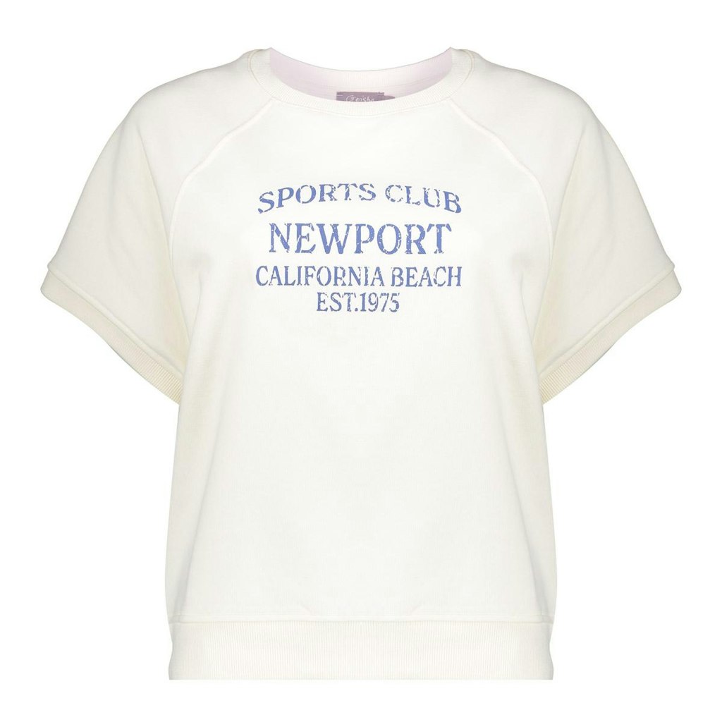 Sweater van Geisha in met korte mouwen, ronde hals, ribboorden en tekstprint op de voorzijde. Materiaal: Katoen 65%| polyester 35%