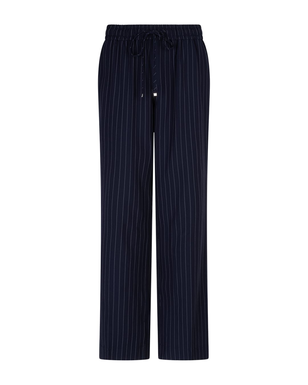 Krijtstreep broek van Red Button met wijde pijpen voorzien van contrasterende bies aan de zijnaden, steekzakken, twee paspelzakken aan de achterzijde en een elastische tailleband voorzien van trekkoord.