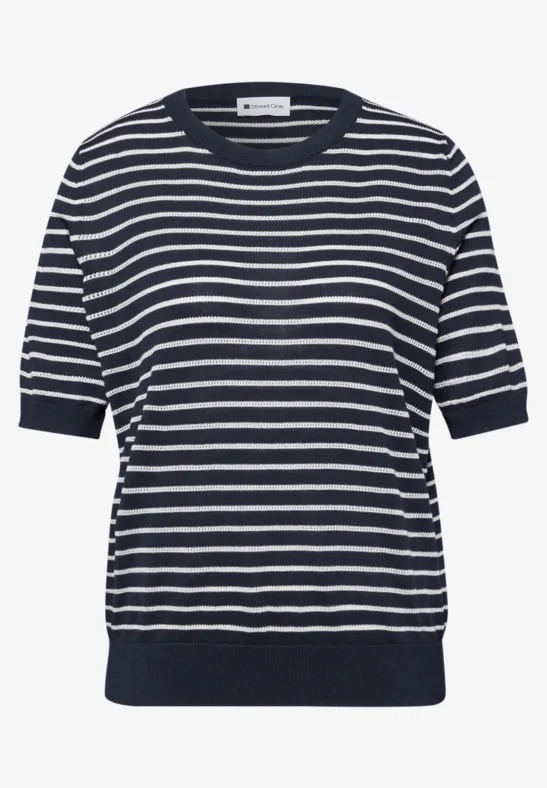 Gebreide trui van Street One in een gestreept structuur dessin met korte mouwen, ronde hals en ribgebreide boorden. Materiaal: Viscose 60%| katoen 40%