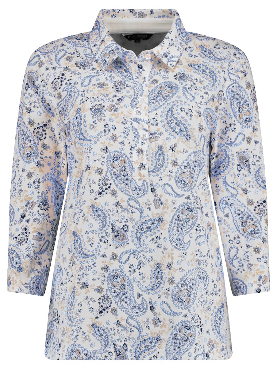 Poloshirt van Bloomings in een all-over dessin met driekwart mouwen en een polokraag voorzien van knoopsluiting. Materiaal: Katoen 46%| modal 46%| elastan 8%