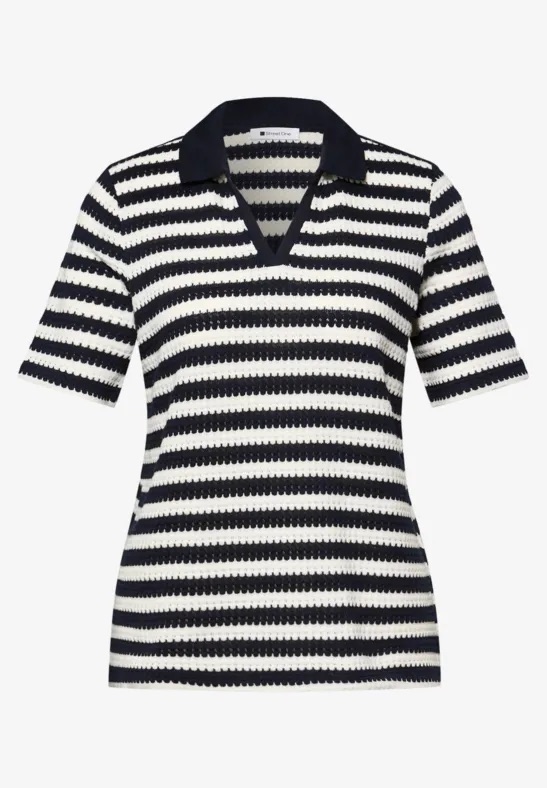 Gestreepte polo van Street One in en structuur desin met korte mouwen, V-hals en zijsplitten. Materiaal: Katoen 65%| polyester 35%