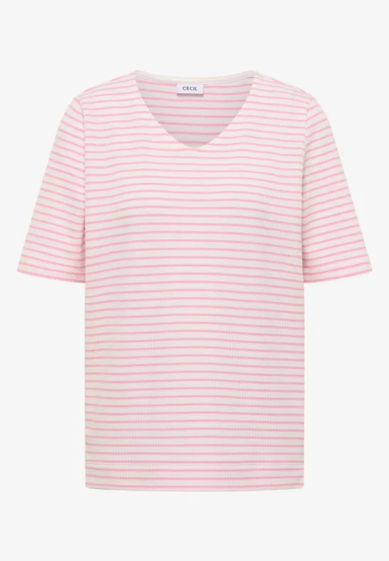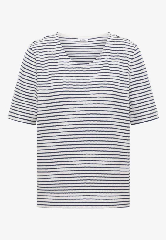 Gestreept shirt van Cecil in een wafel structuur met korte mouwen en een afgeronde V-hals. Materiaal: Katoen 68%| polyester 19%| viscose 10%| elastan 3%