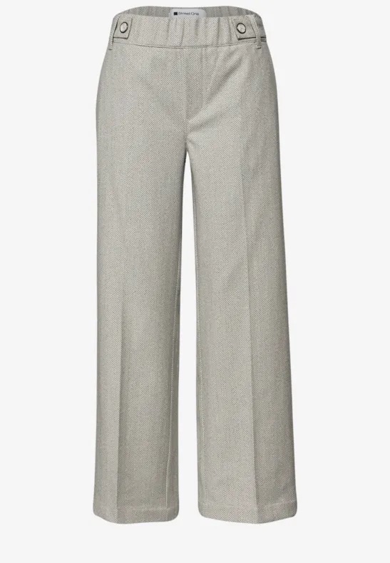 Enkellange broek van Street One in een visgraat dessin met steekzakken, twee paspelzakken aan de achterzijde, knoopdetail en een elastische tailleband. Materiaal: Katoen 54%| viscose 40%| elastan 6%