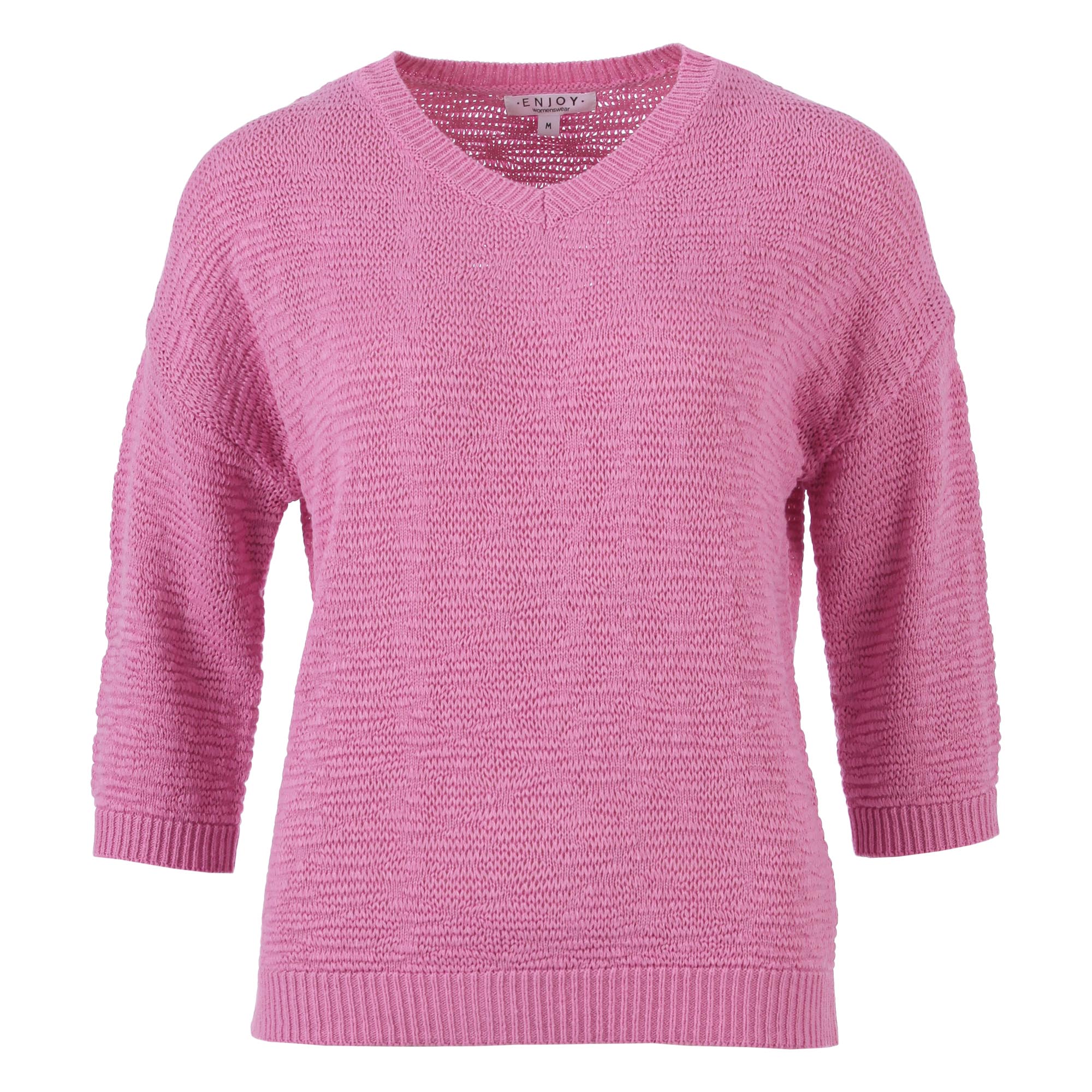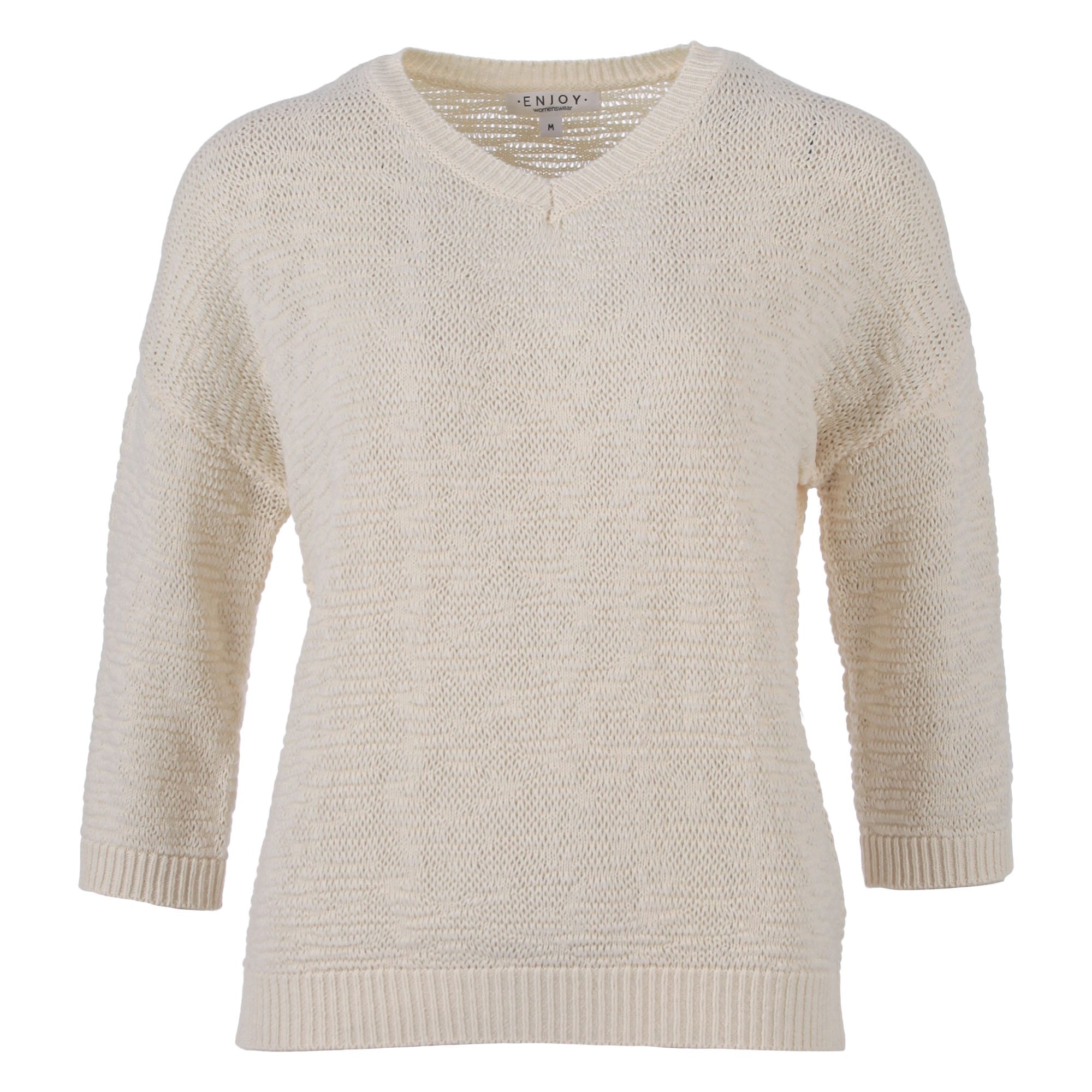 Trui van Enjoy in een subtiel structuur dessin met driekwart mouwen, V-hals en ribgebreide boorden. Materiaal: Acryl 100%