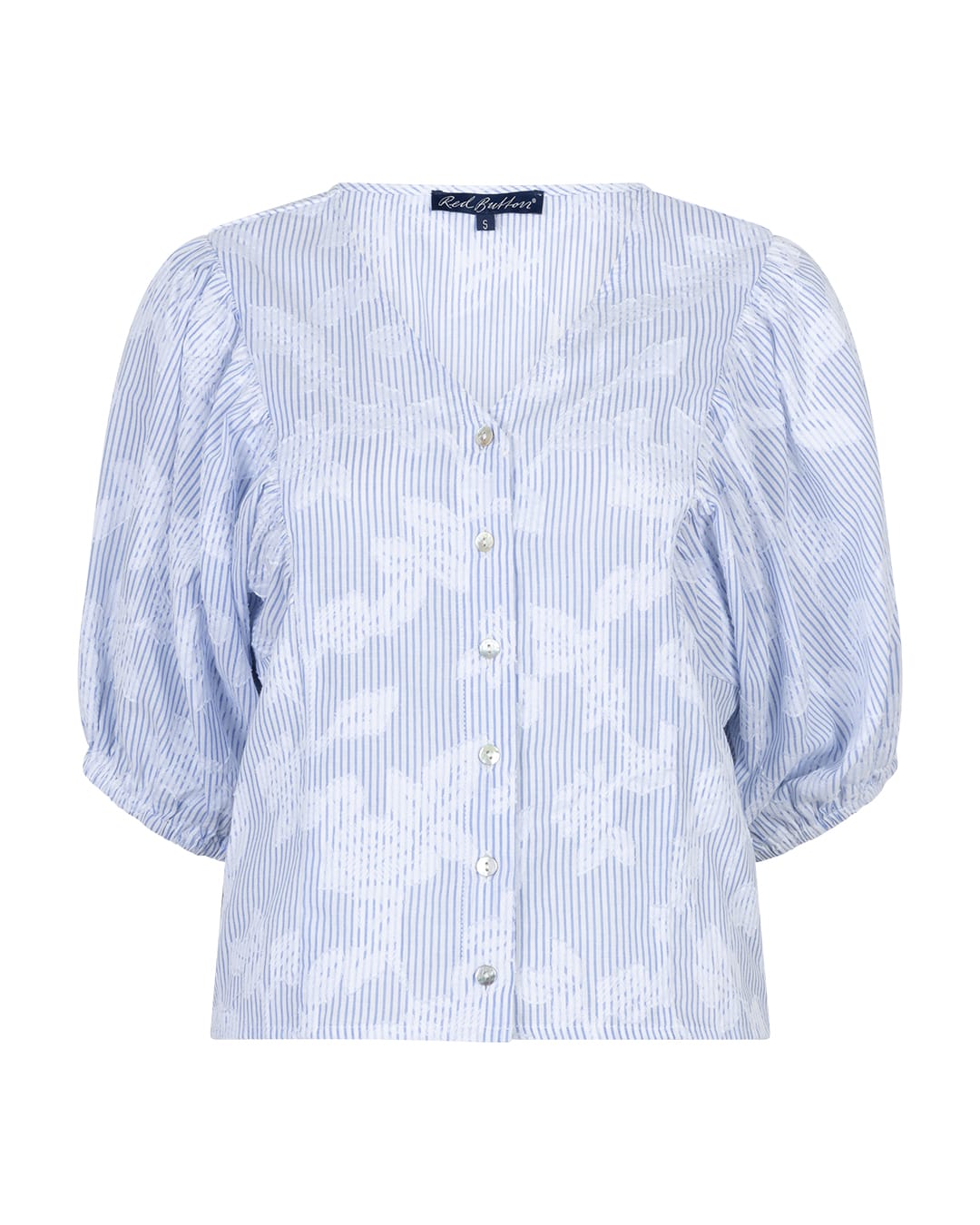 Gestreepte blouse van Red Button met borduursels, halflange ballonmouwen voorzien van elastische boorden, V-hals en knoopsluiting. Materiaal: BCI katoen 52%| polyester 48%