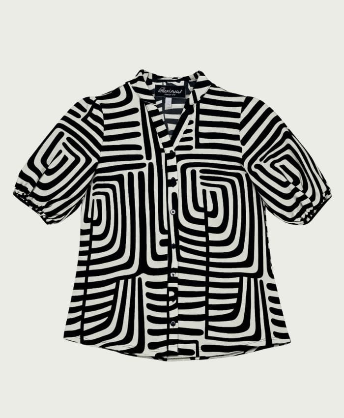 Blouse van Elvira in een zebra dessin met korte pofmouwen, opstaande kraag, V-hals en een knoopsluiting. Materiaal: Viscose 100%