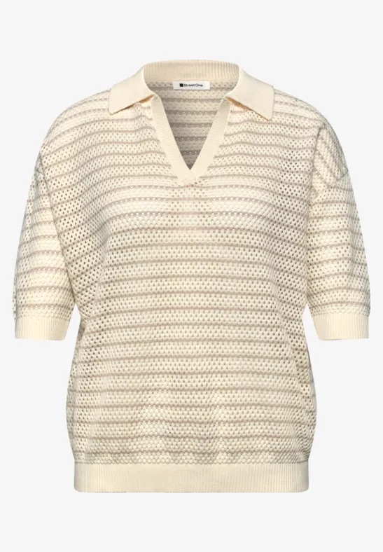 Gestreepte trui van Street One in een opengewerkt dessin met korte mouwen, polokraag, V-hals en ribgebreide boorden. Materiaal: Katoen 100%