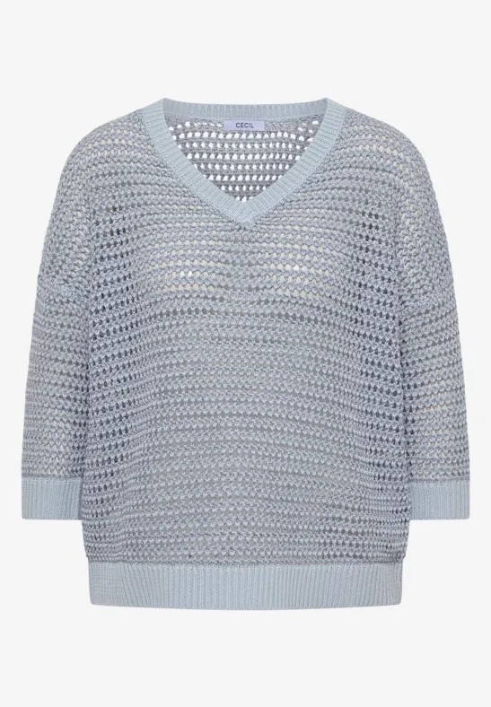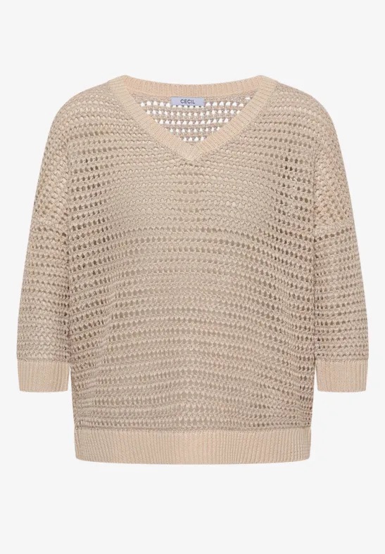 Opengewerkte trui van Cecil met driekwart mouwen, verlaagde schoudernaden, V-hals en ribgebreide boorden.