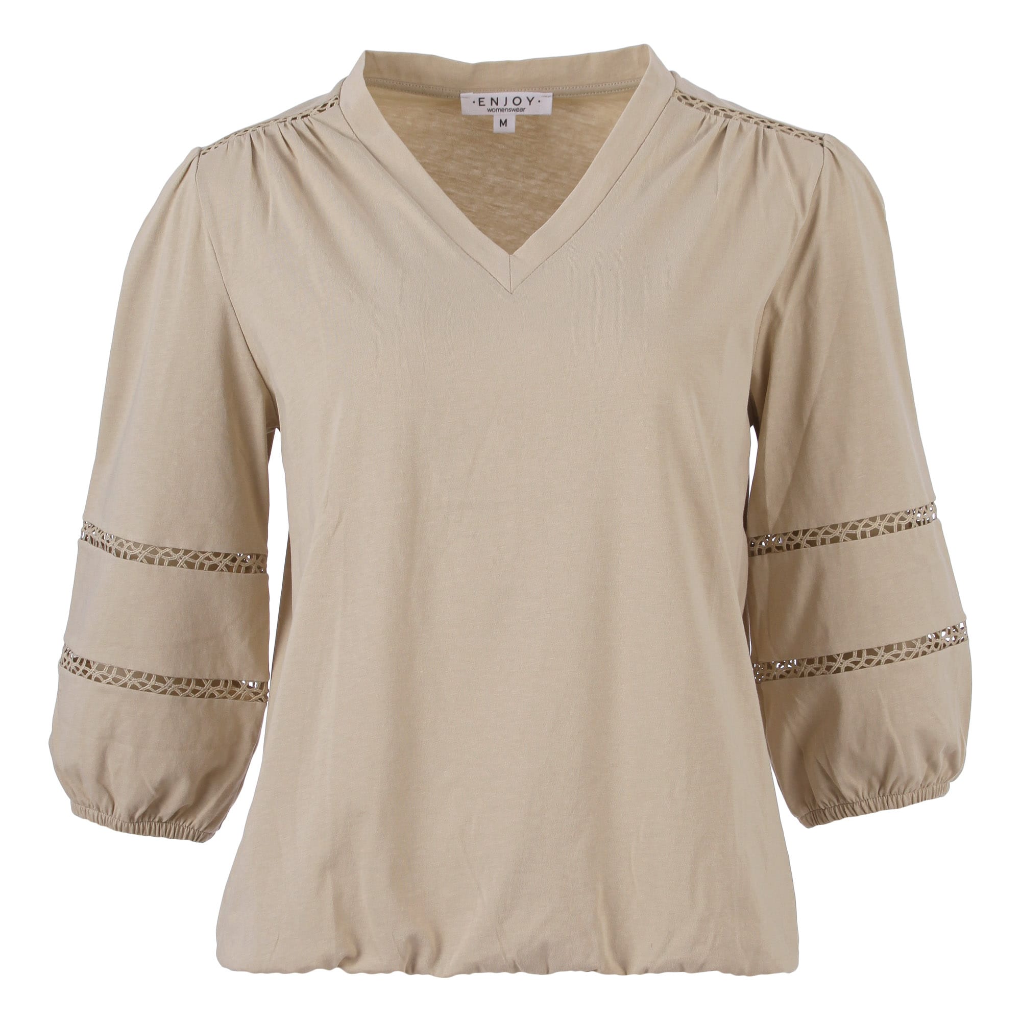 Blouson van Enjoy met driekwart mouwen voorzien van elastische manchetten, opengewerkte detals, V-hals en een elastische zoom. Materiaal: Katoen 100%