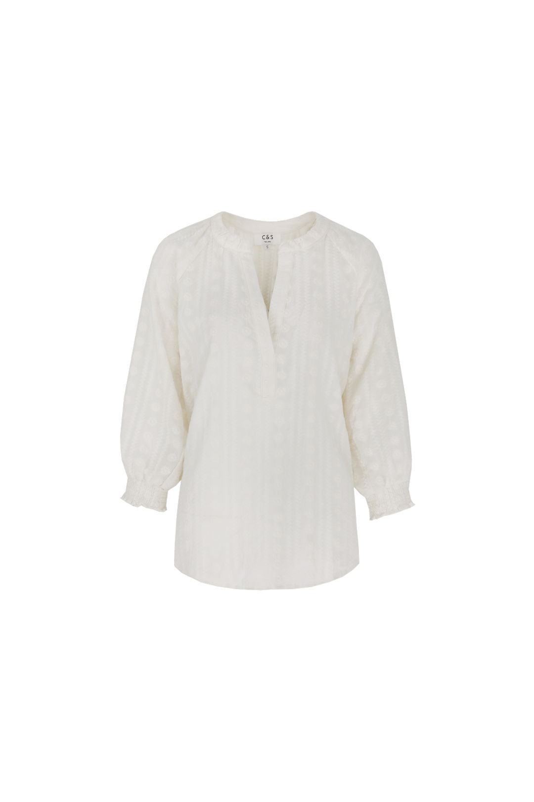 Blouse van C&S in een structuur dessin met driekwart pofmouwen voorzien van gesmokte manchetten en een ronde hals voorzien van split.