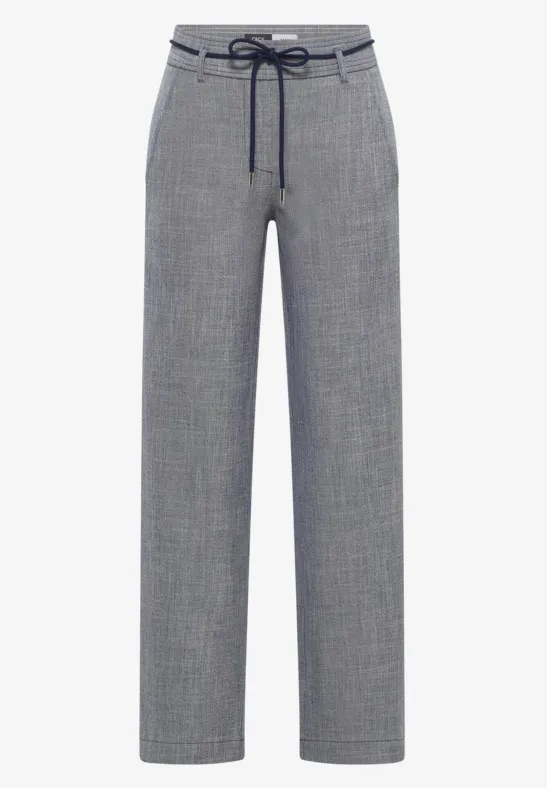 Gemêleerde broek van Cecil met wijde pijpen, steekzakken, twee paspelzakken aan de achterzijde en een elastische tailleband voorzien van een losse trekkoord.