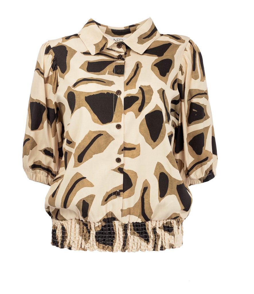 Blouson van N.E.D. in een all-over dessin met halflange pofmouwen, kraag, knoopsluiting en een gesmokte zoom. Materiaal: Viscose 98%| elastan 2%
