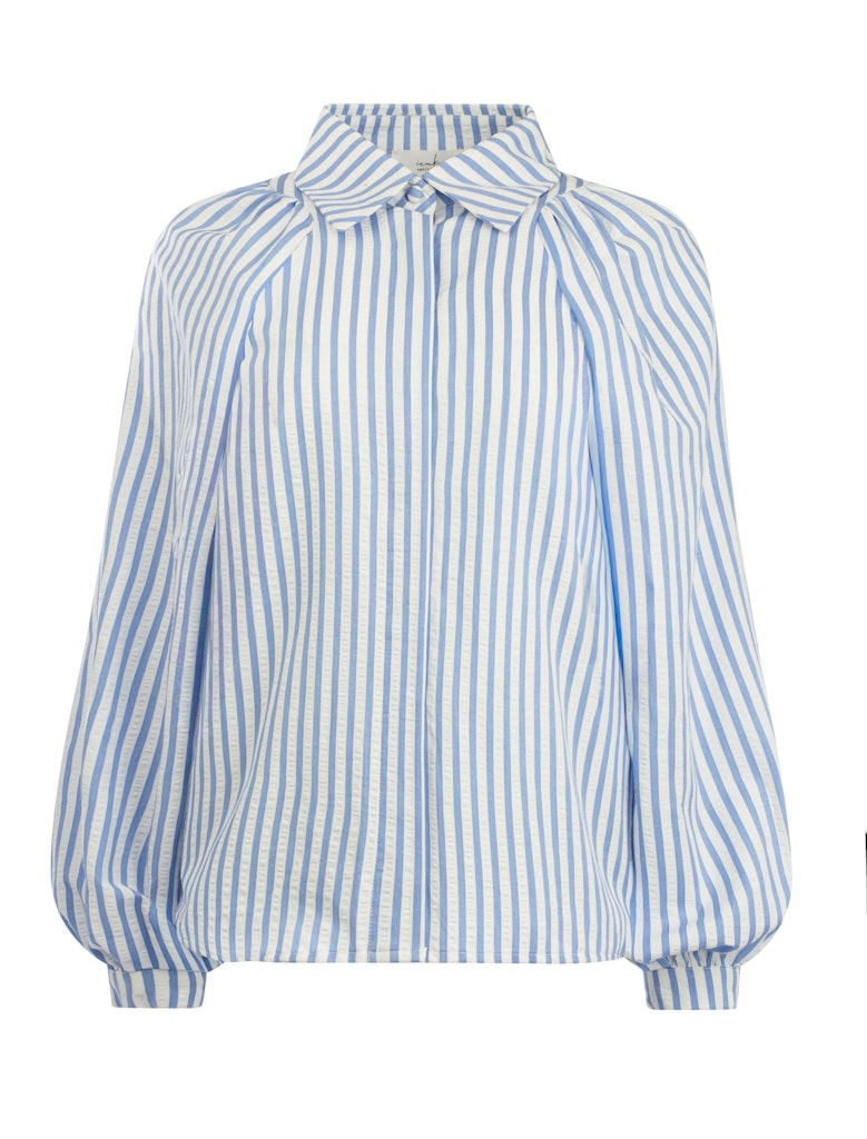 Gestreepte seersucker blouse van ICNK Amsterdam met lange pofmouwen, plooidetail bij de schouders, kraag en een verborgen knoopsluiting. Materiaal: Polyester 100%