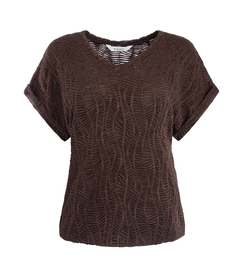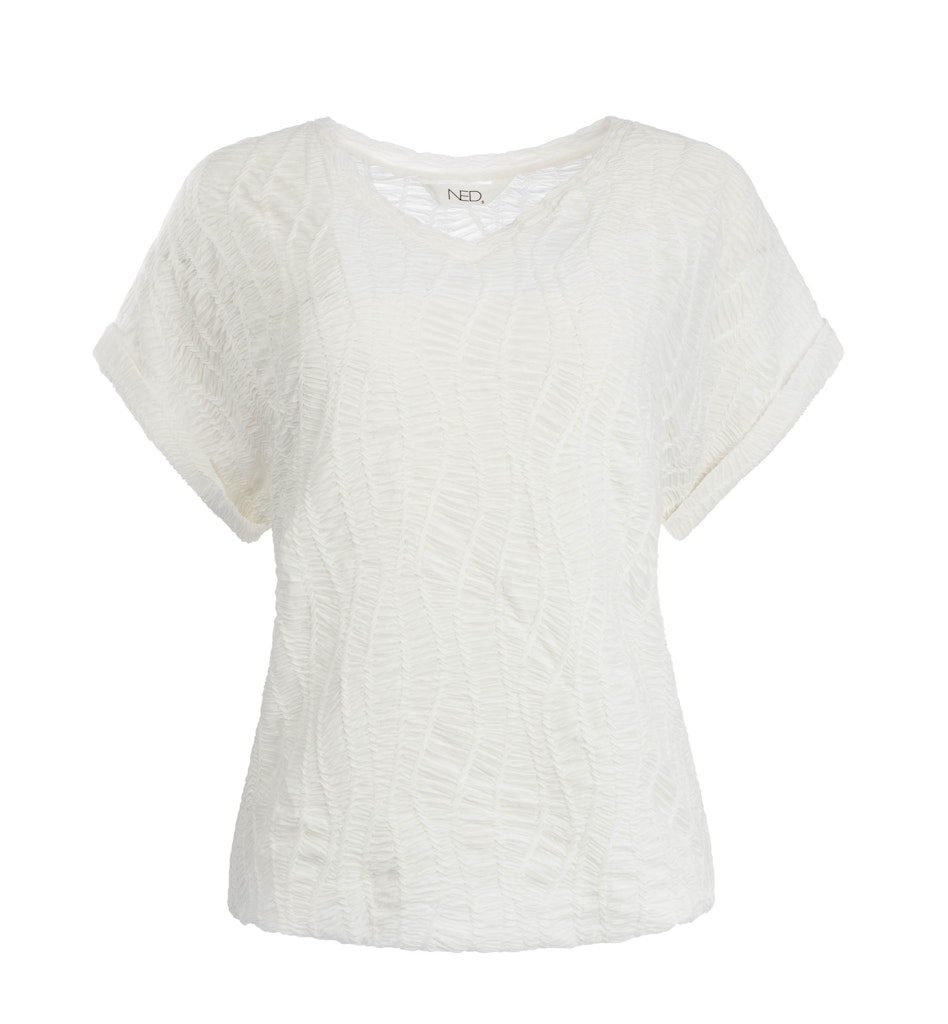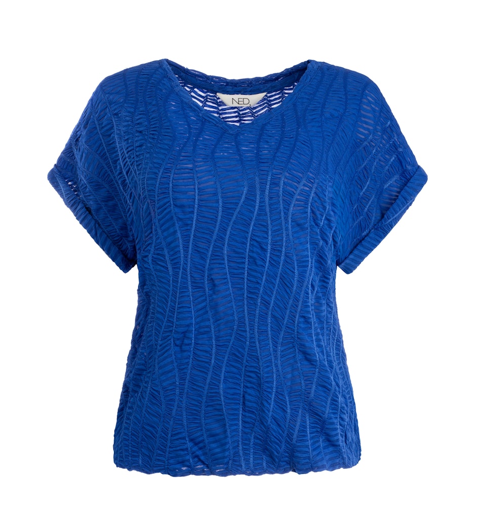 Shirt van N.E.D. in een structuur dessin met korte aangeknipte mouwen voorzien van omslag, V-hals en een elastische zoom. Materiaal: Polyester 95%| elastan 5%