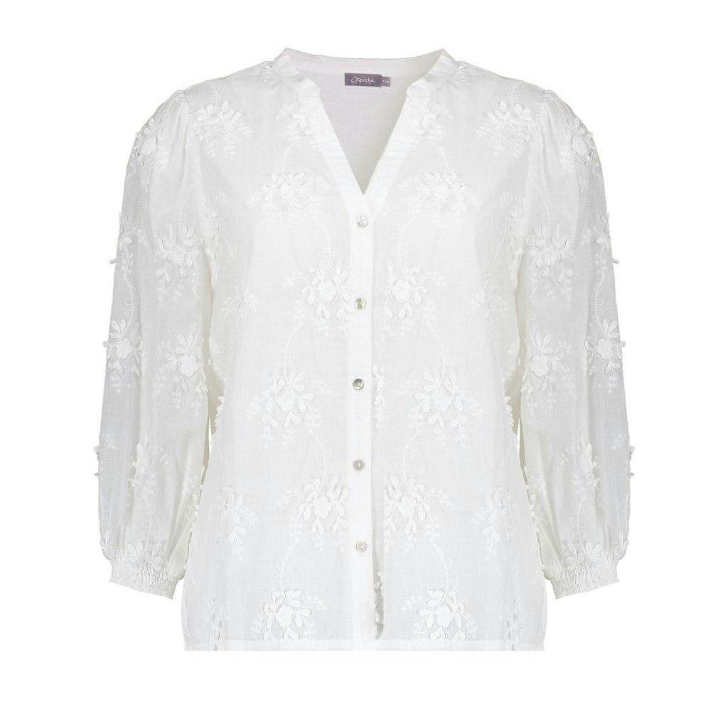 Blouse van Geisha met geborduurde accenten, driekwart semi-transparante pofmouwen, V-hals en een knoopsluiting. Materiaal: Katoen 50%, achterzijde: Viscose 50%| polyester 50%