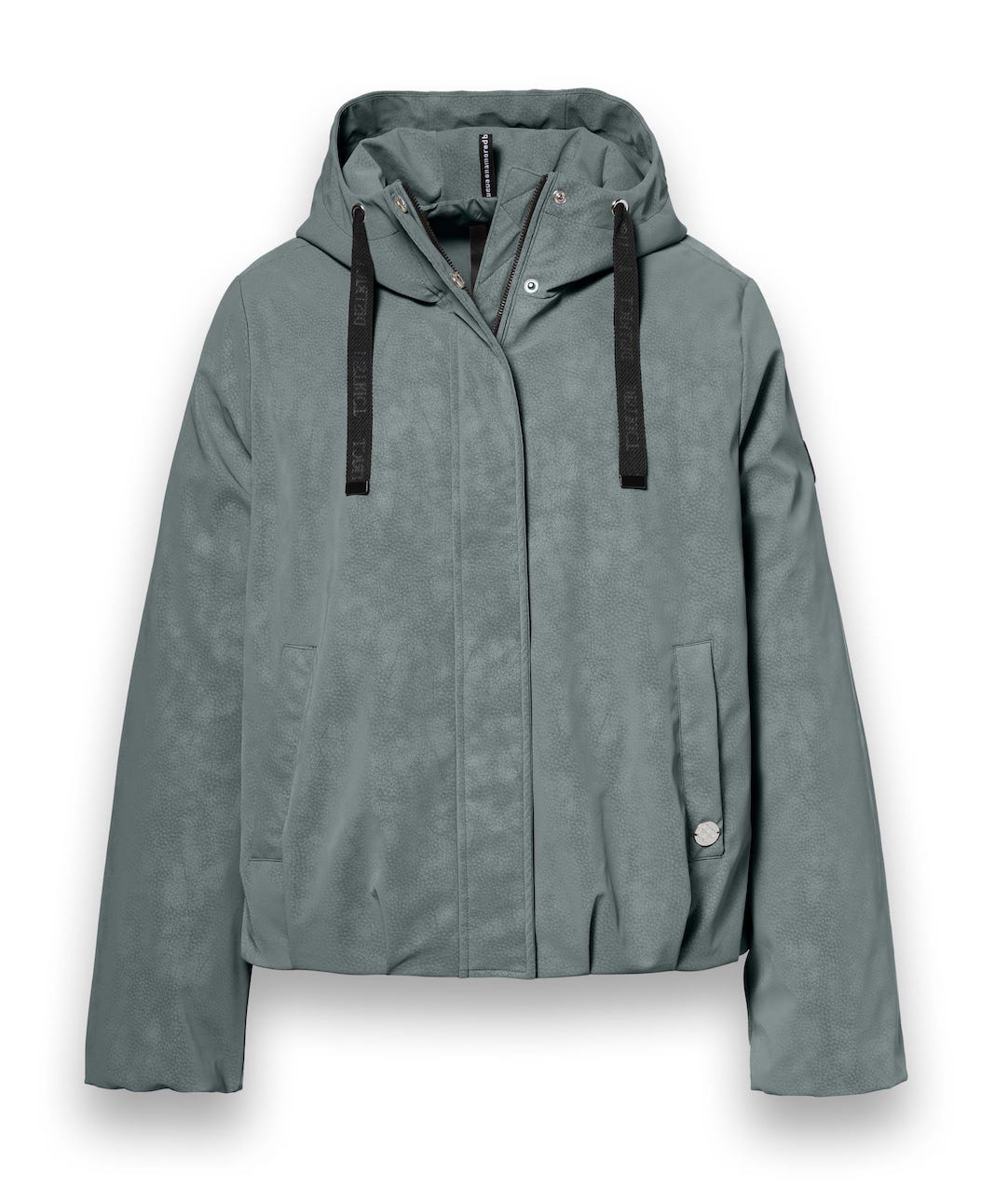 Waterafstotende suèdine jack van District met een verborgen drukknoop- en ritssluiting, capuchon voorzien van trekkoord, twee steekzakken en een geplooide zoom.