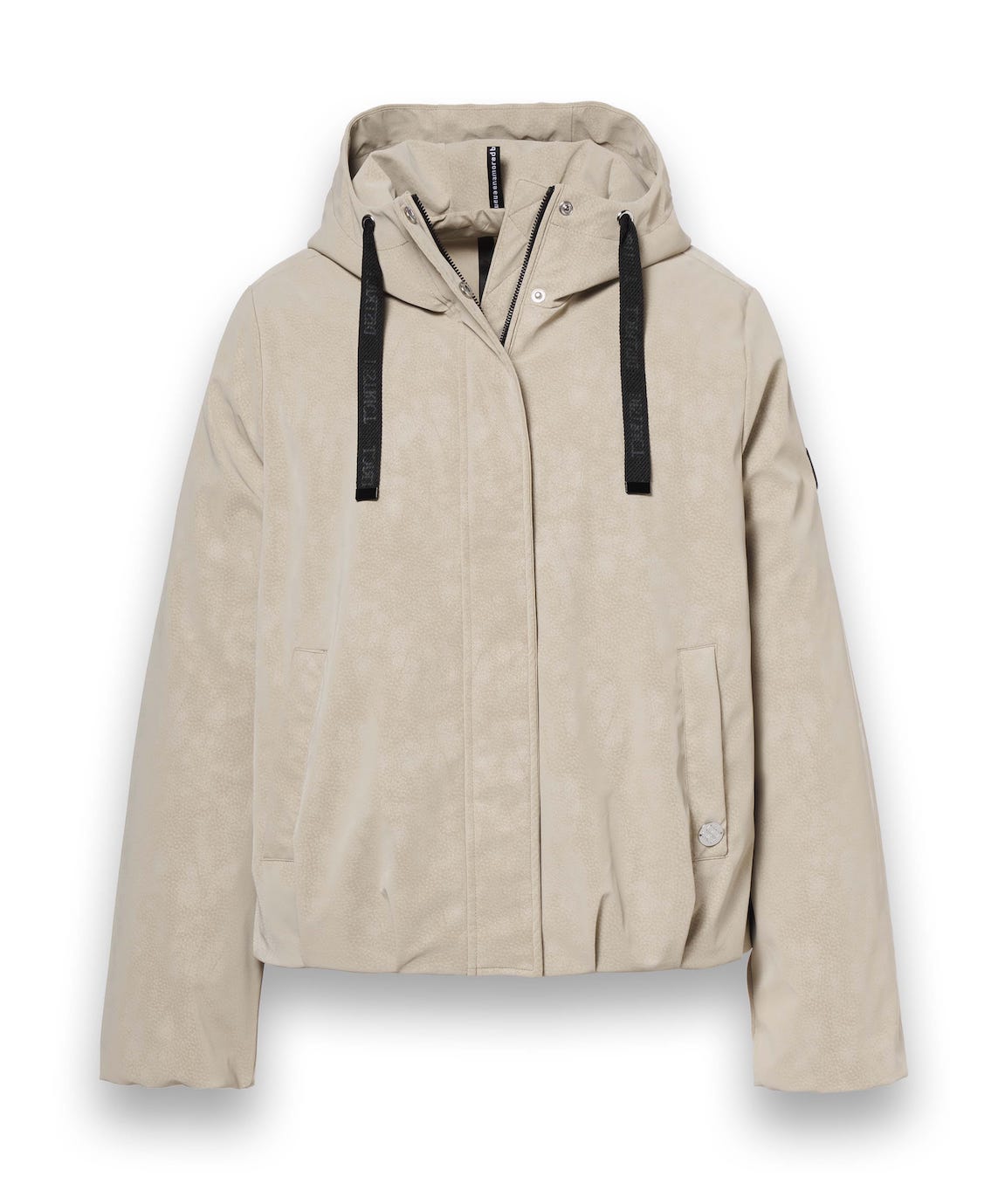 Waterafstotende suèdine jack van District met een verborgen drukknoop- en ritssluiting, capuchon voorzien van trekkoord, twee steekzakken en een geplooide zoom.