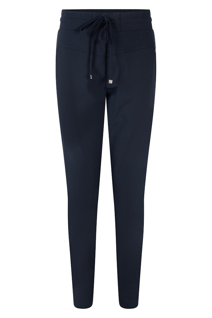 Broek van Zoso in travel kwaliteit met smalle pijpen, steekzakken, klepzakken aan de achterzijde en een elastische tailleband voorzien van trekkoord.