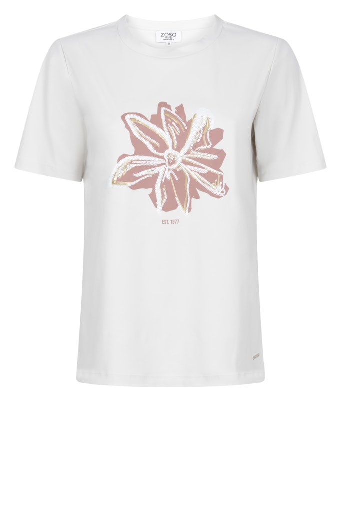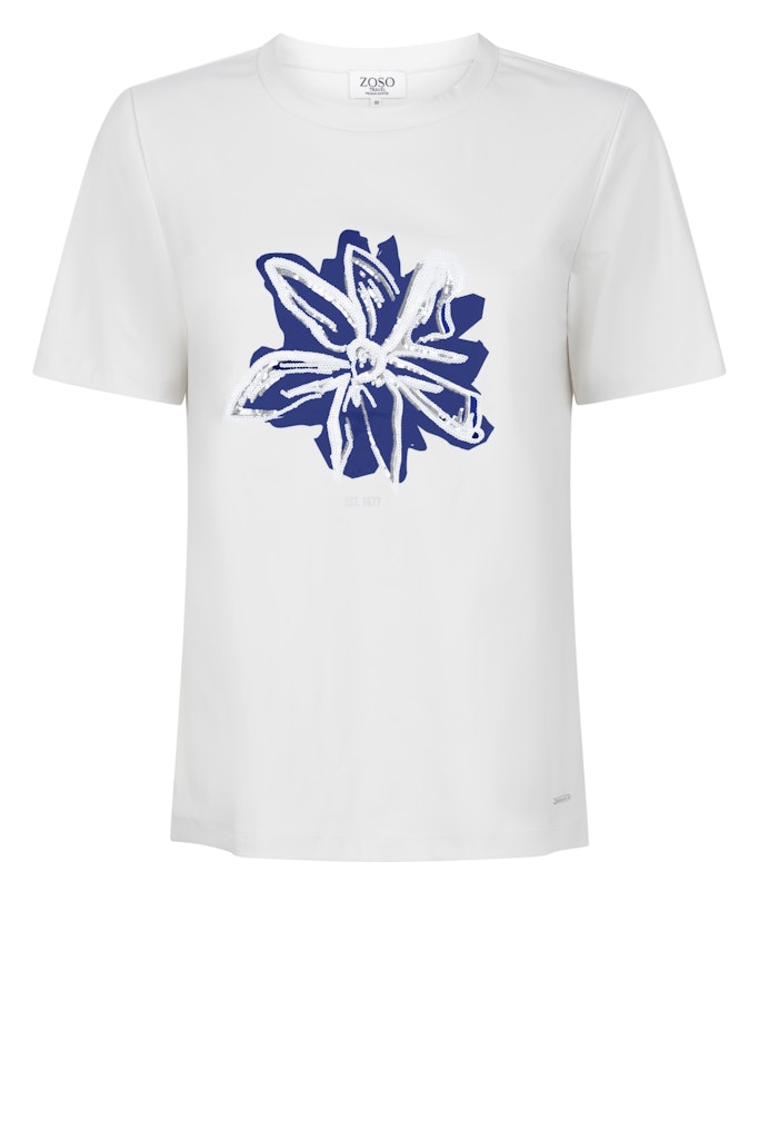 T-shirt van Zoso in travel kwaliteit met korte mouwen, ronde hals en een bloemenprint op de borst. Materiaal: Polyamide 80%| elastan 20%