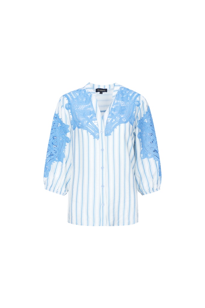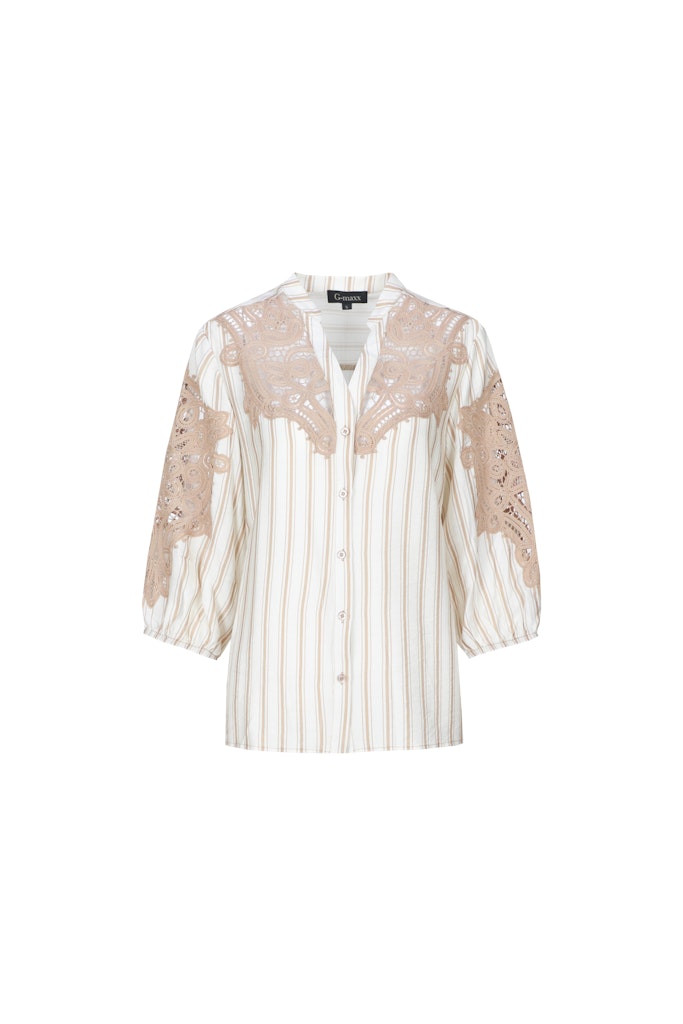 Gestreepte blouse van G-maxx voorzien van kanten details met driekwart pofmouwen, opstaande kraag, V-hals en een knoopsluiting. Materiaal; Viscose 80%| polyamide 20%