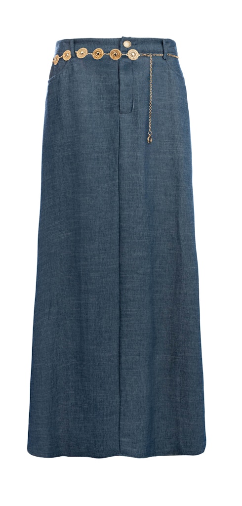 Lange A-lijn rok van INCK Amsterdam in een denim-look met een knoop- en ritssluiting. Materiaal: Viscose 50%| polyester 31%| polyamide 19%