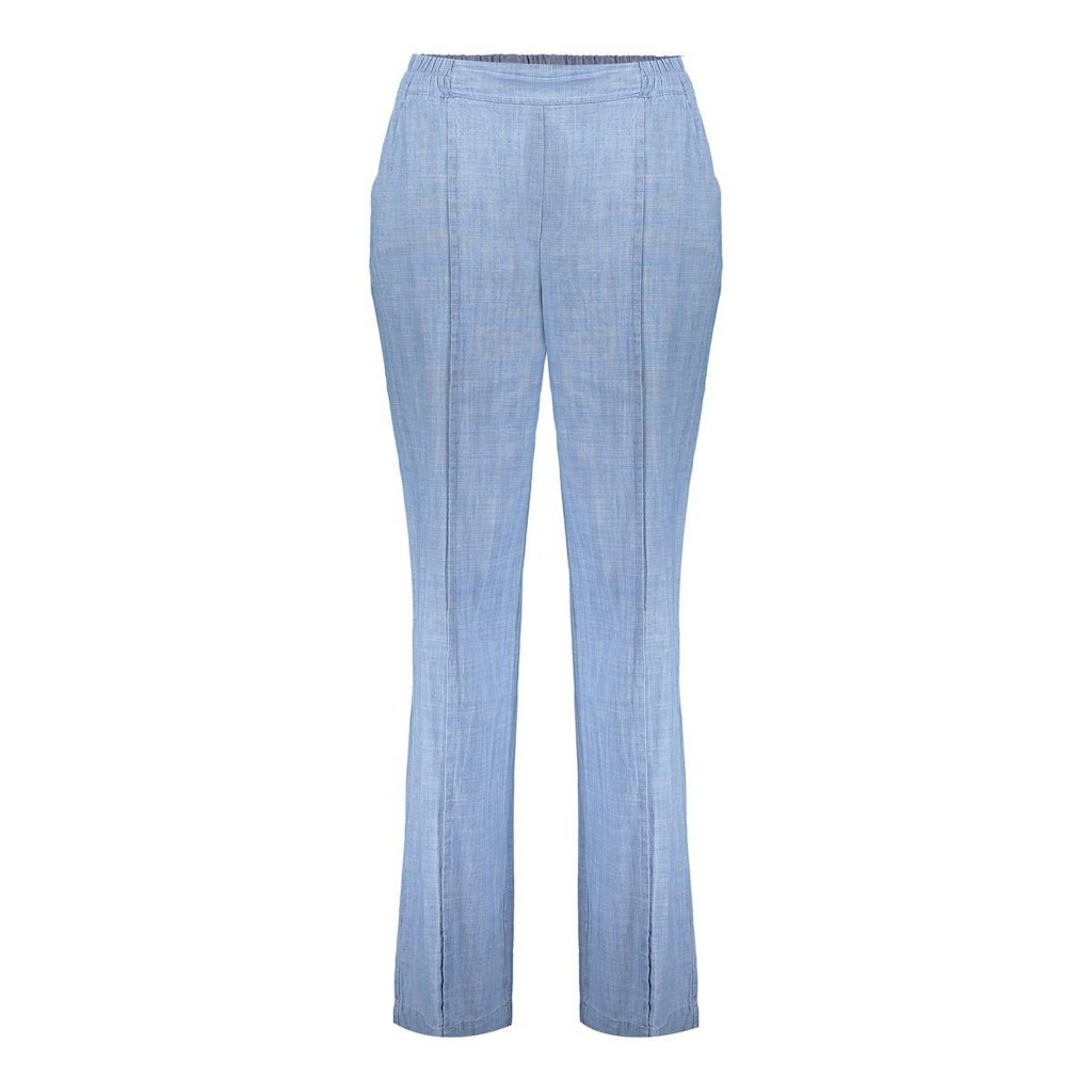 Cambray broek van Geisha met wijde pijpen, steekzakken, doorgestikte naad aan de vooorzijde en een elastische tailleband. Materiaal: Katoen 100%