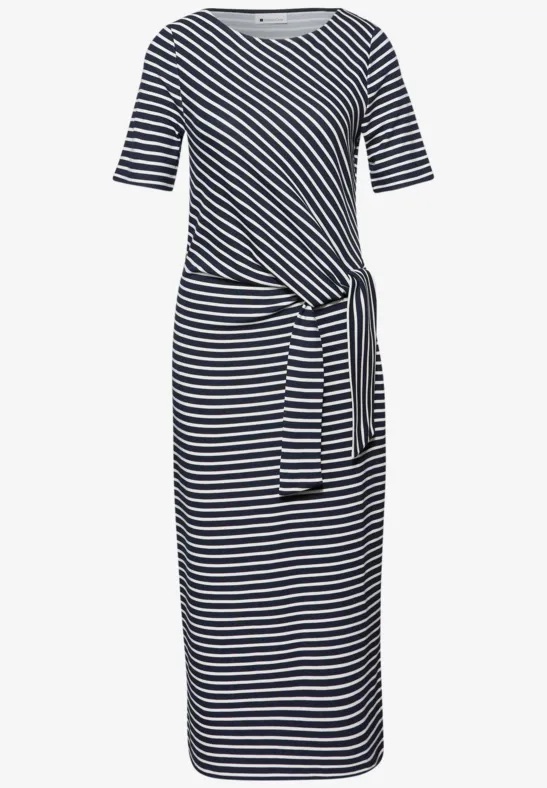 Gestreepte jersey jurk van Street One met korte mouwen, ronde hals, zijsplitten en een knoopdetail in de taille.