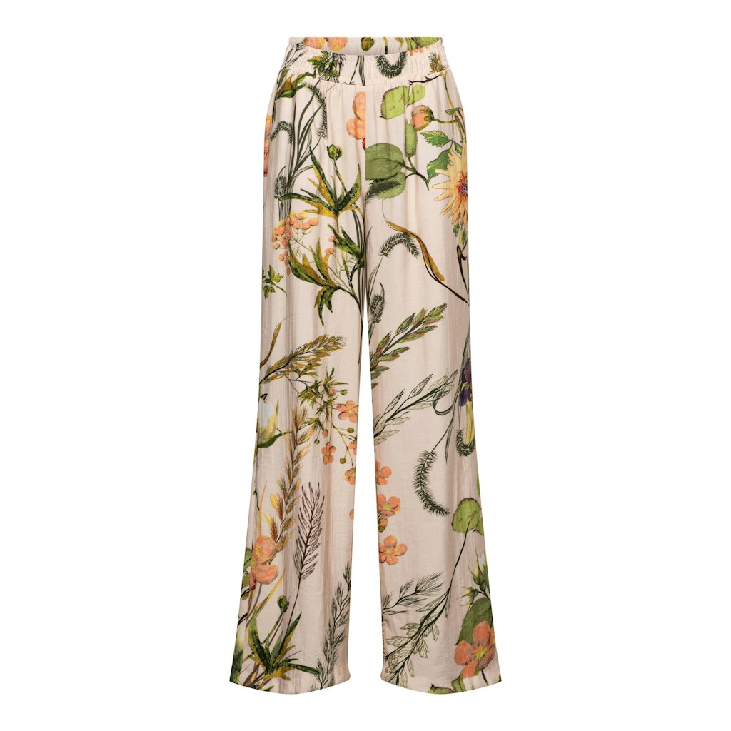 Broek van &Co in een bloemen dessin met wijde pijpen, steekzakken en een elastische tailleband. Materiaal: Viscose 84%| polyamide 16%