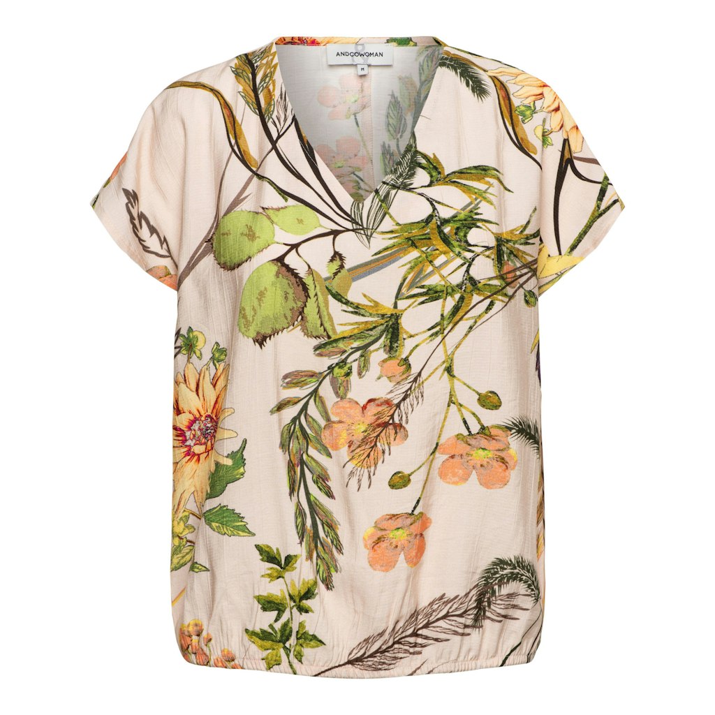 Top van &Co Woman in een bloemen dessin met korte aangeknipte mouwen,V-hals en een elastische zoom. Materiaal: Viscose 84%| polyamide 16%
