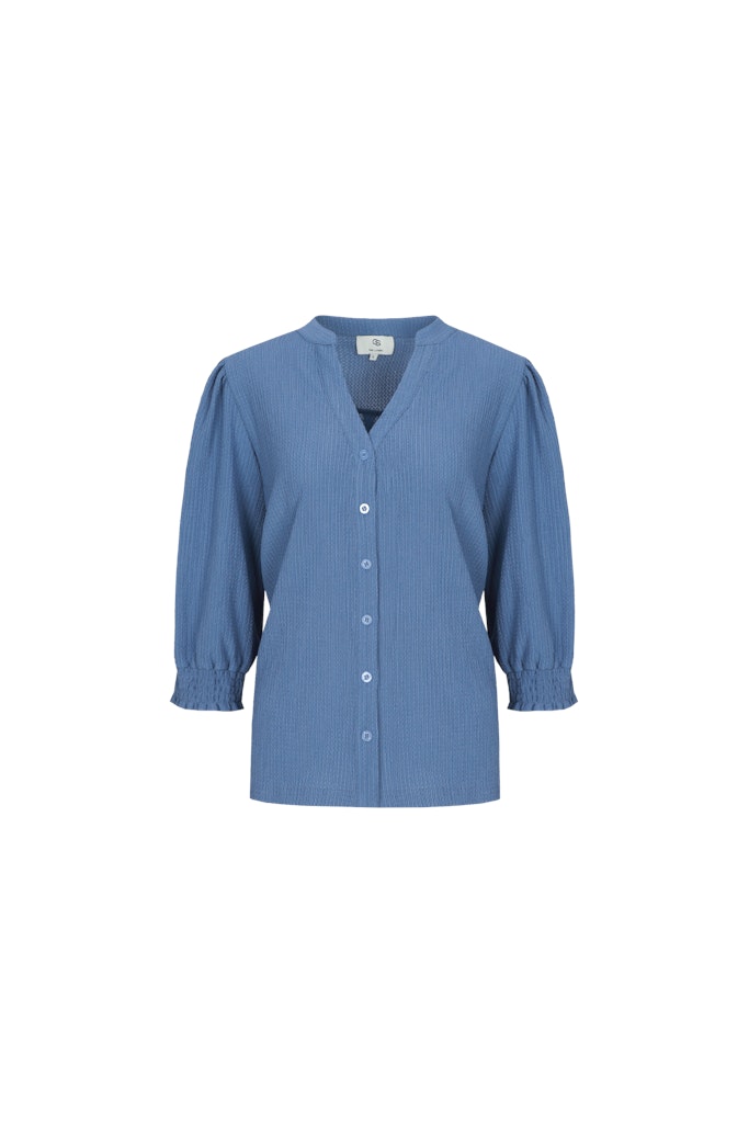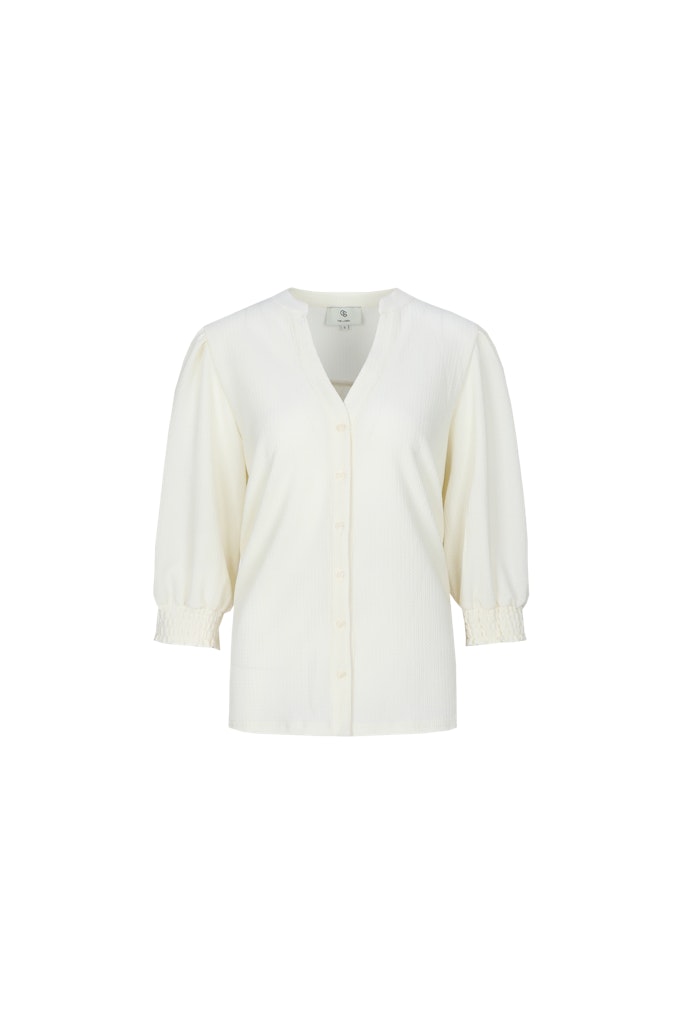 Blouse van C&S The Label in een structuur dessin met driekwart pofmouwen voorzien van gesmokte manchetten, V-hals en een knoopsluiting.