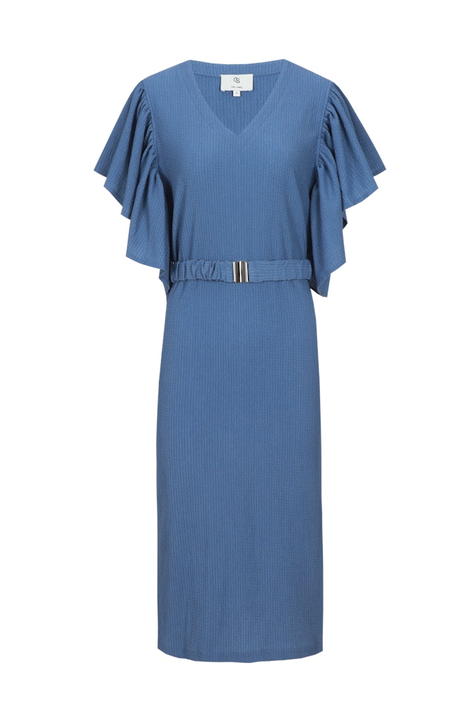 Jurk van C&S The Label met korte ruchemouwen, V-hals en een bijpassende ceintuur in de taille. Materiaal: Polyester 95%| elastan 5%