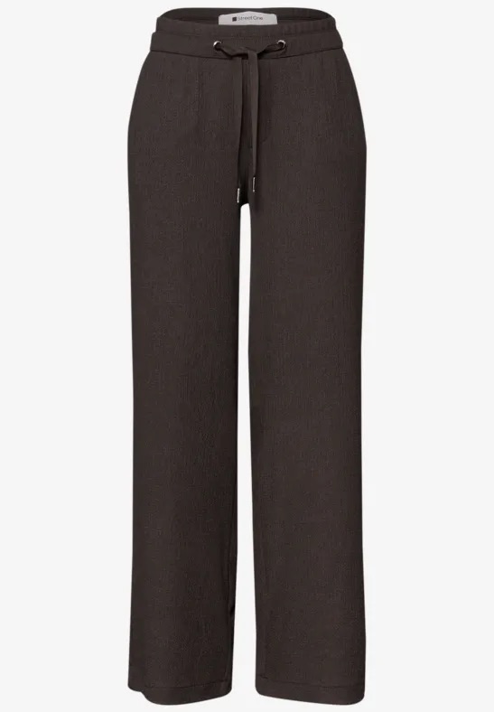 Broek van Street One in een structuur dessin met wijde pijpen, steekzakken, twee paspelzakken aan de achterzijde en een elastische tailleband voorzien van trekkoord.