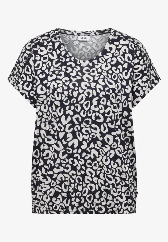 Shirt van Cecil in een animal dessin met korte aangeknipte mouwen, kanten detail op de schouders, afgeronde V-hals en een elastische zoom.