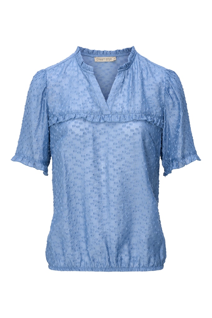 Blousetop van Dreamstar in een structuur dessin met halflange mouwen, V-hals, elastische zoom en ruffles details. Materiaal: Viscose 75%| polyamide 25%