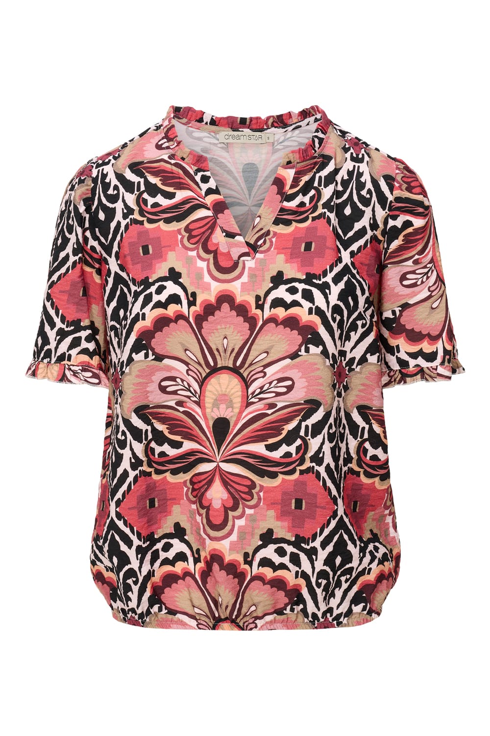 Blousetop van Dreamstar in een barok dessin met korte mouwen, V-hals en elastische zoom. Materiaal: Viscose 85%| polyamide 15%