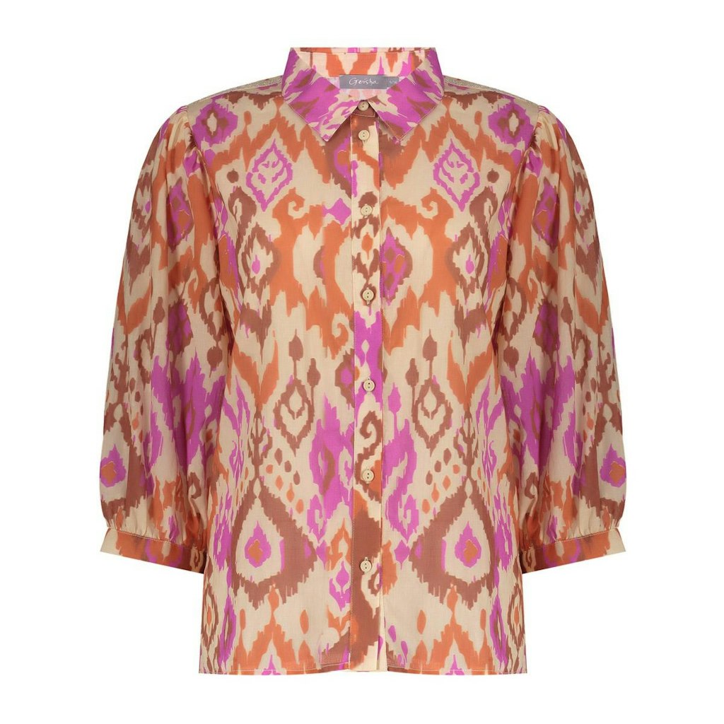Blouse van Geisha in een all-over dessin met driekwart pofmouwen, kraag en een knoopsluiting. Materiaal: Katoen 100%