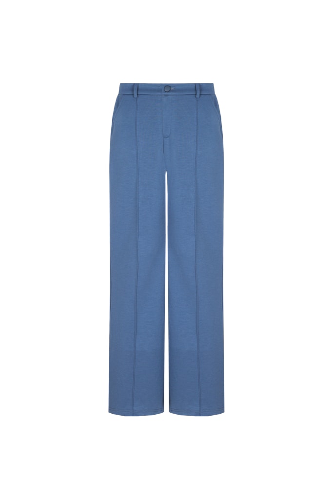 Broek van C&S The Label met wijde pijpen, knoop- en ritssluiting, pintucknaad aan de voorzijde, twee paspelzakken en een elastische tailleband aan de achterzijde.