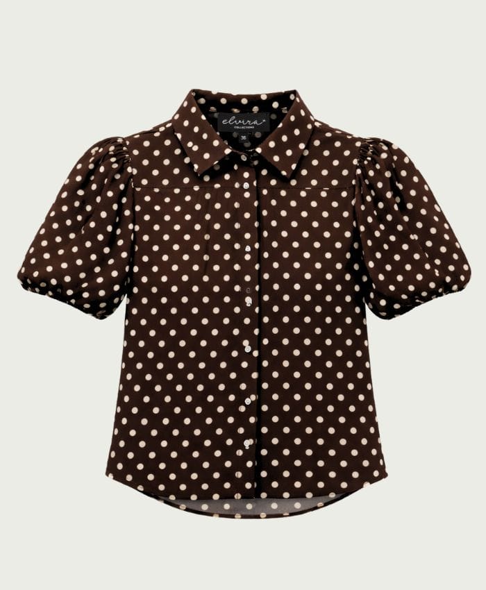 Blouse van Elvira in een all-over stippen dessin met korte pofmouwen, kraag en knoopsluiting.