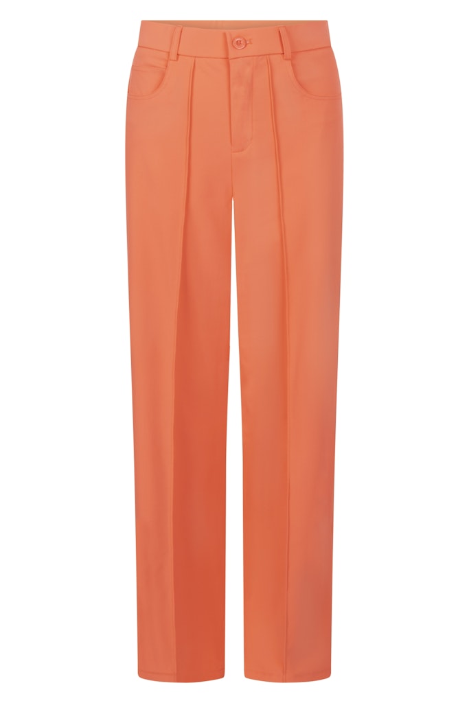 Broek van Zoso met wijde pijpen, knoop- en ritssluiting, steekzakken, pintucknaad aan de voorzijde en twee opgestikte achterzakken. Materiaal: Polymide 80%| elastan 20%