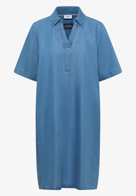 Kinielange jurk van Cecil in een denim-look met korte mouwen, kraag, V-hals en steekzakken in de zijnaden. Materiaal: Lyocell 76%| katoen 24%