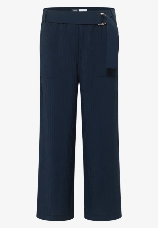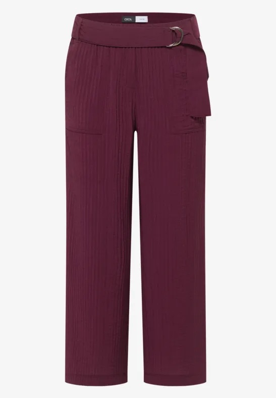 Enkellange broek van Cecil in een ribstructuur met wijde pijpen, steekzakken, twee paspelzakken aan de achterzijde en een ceintuur in de taille.