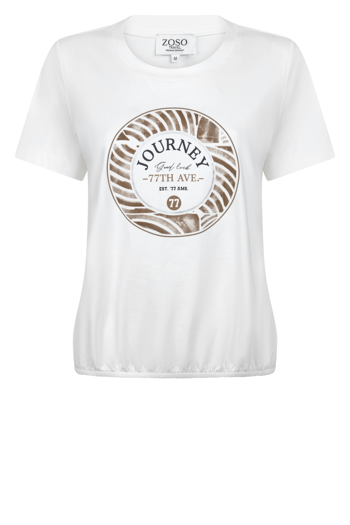 T-shirt van Zoso met korte mouwen, ronde hals, ronde grafische print aan de voorzijde en een elastische zoom. Materiaal: Katoen 95%| elastan 5%