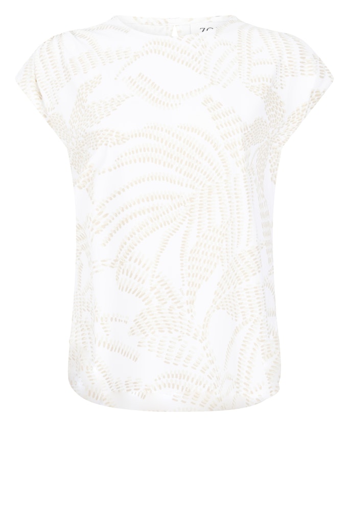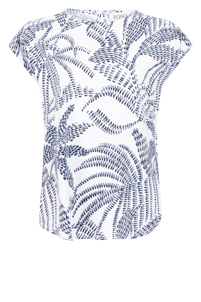 Shir van Zoso in travel kwaliteit met een all-over dessin, korte aangeknipte mouwen en een ronde hals. Materiaal: Polyamide 80%| elastan 20%